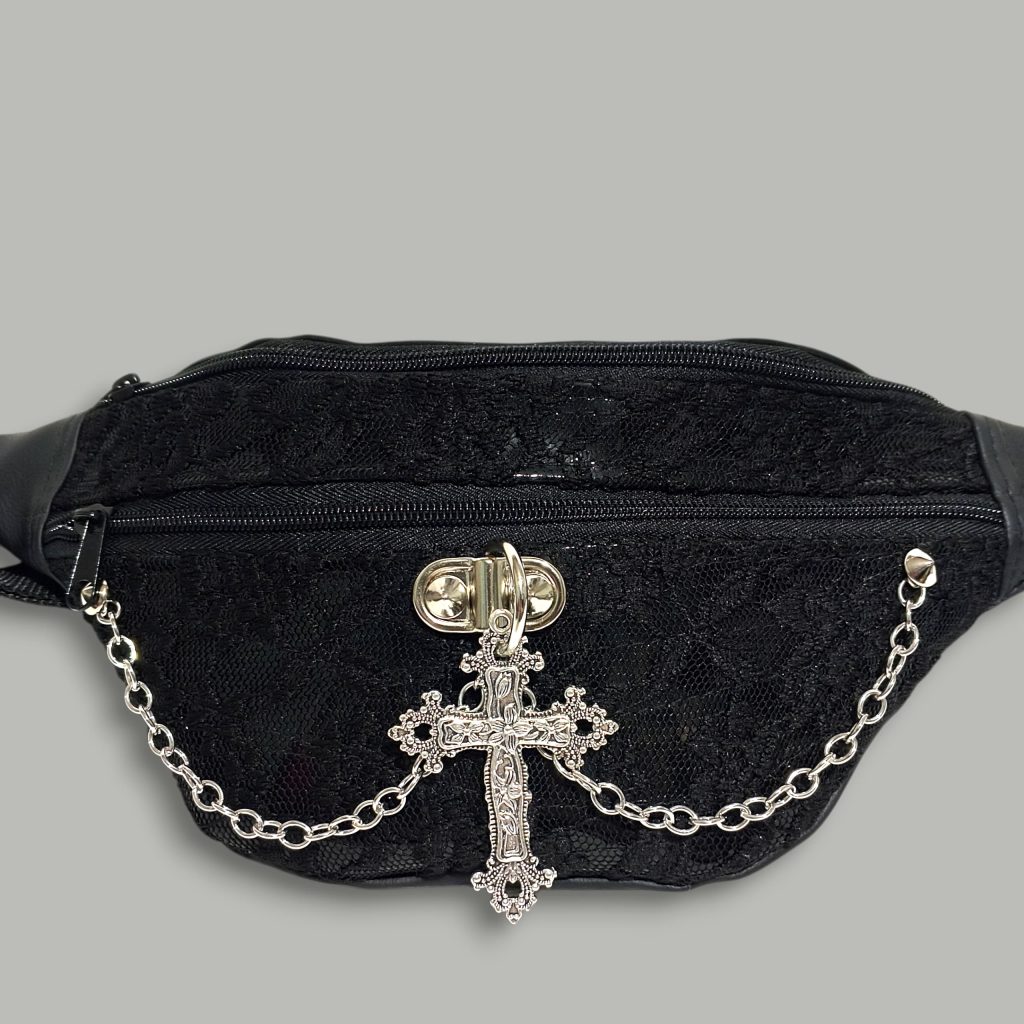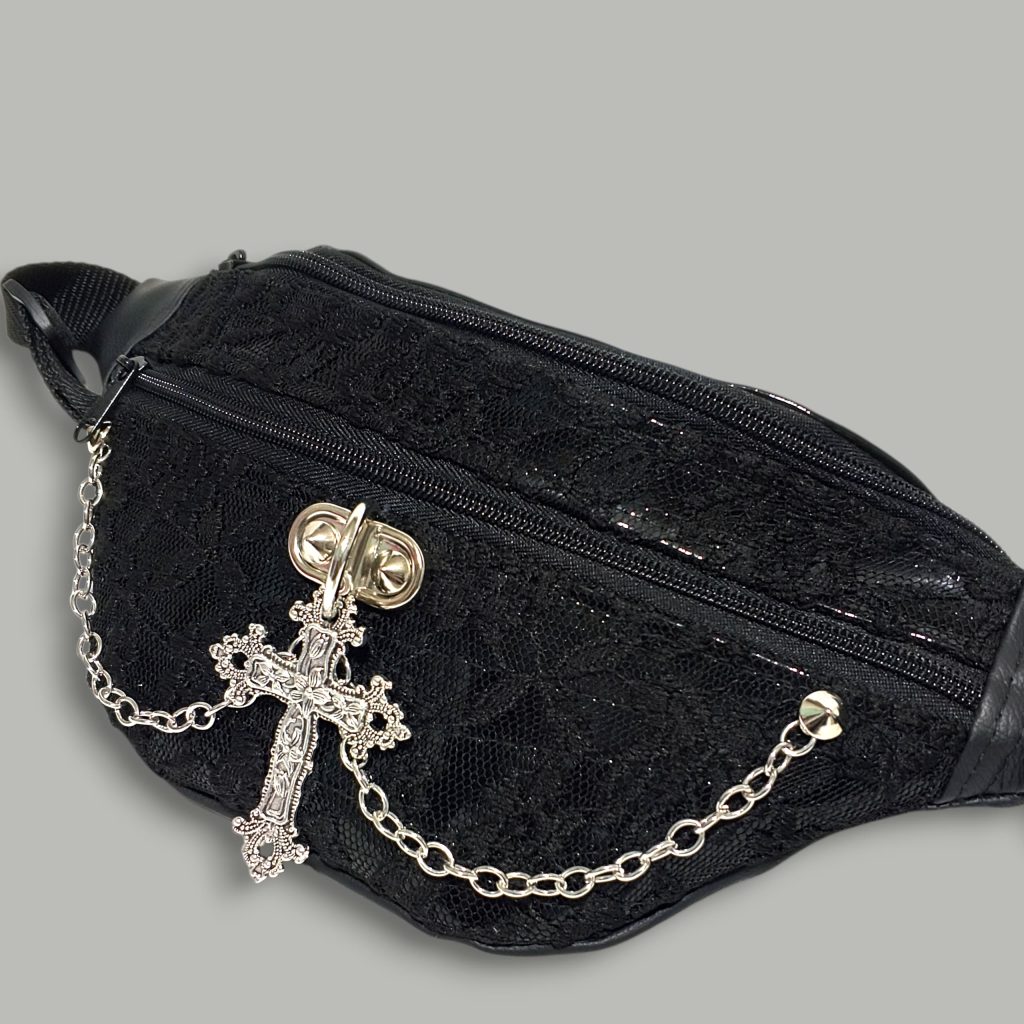 Banano diseño tradicional hecho en charol con encaje, inspirado en la moda victoriana, adornado con una cruz y cadena metálica