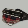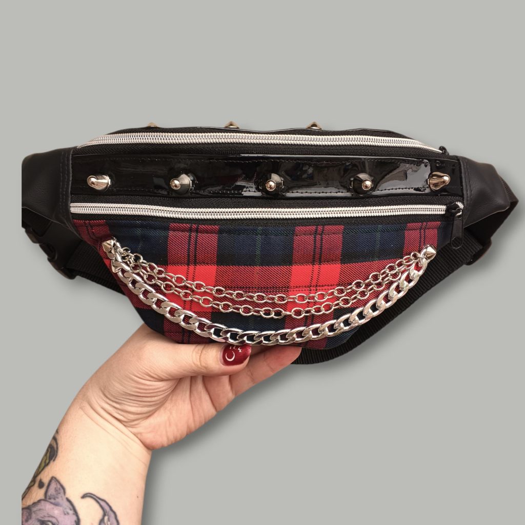 Banano diseño tradicional hecho en ecocuero con tartan rojo, Adornado con cadenas y tachas metálicas