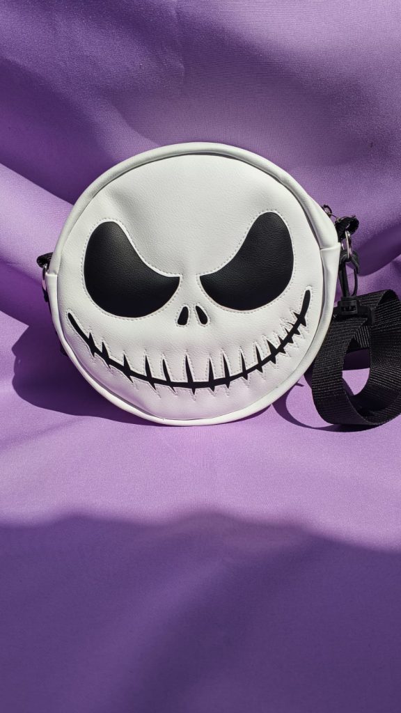 Cartera inspirada en Jack Skellington el rey calabaza del clásico del cine the nightmare before christmas, hecho en ecocuero y detalles de la cara en charol negro cuidadosamente cosido individualmente.