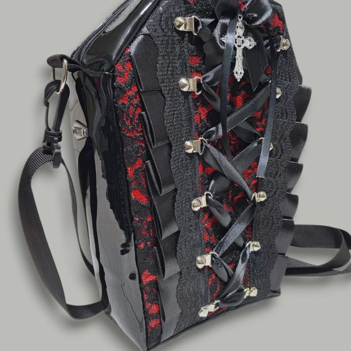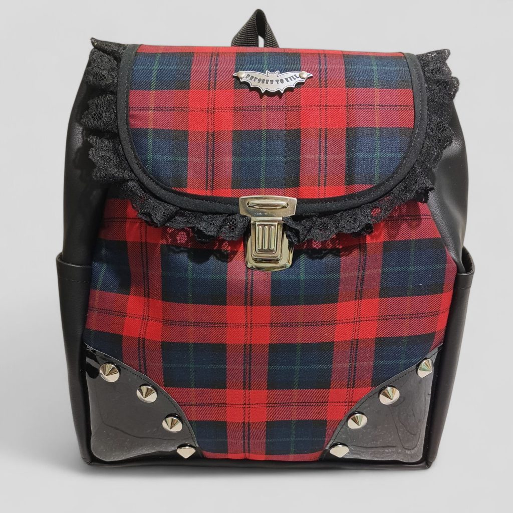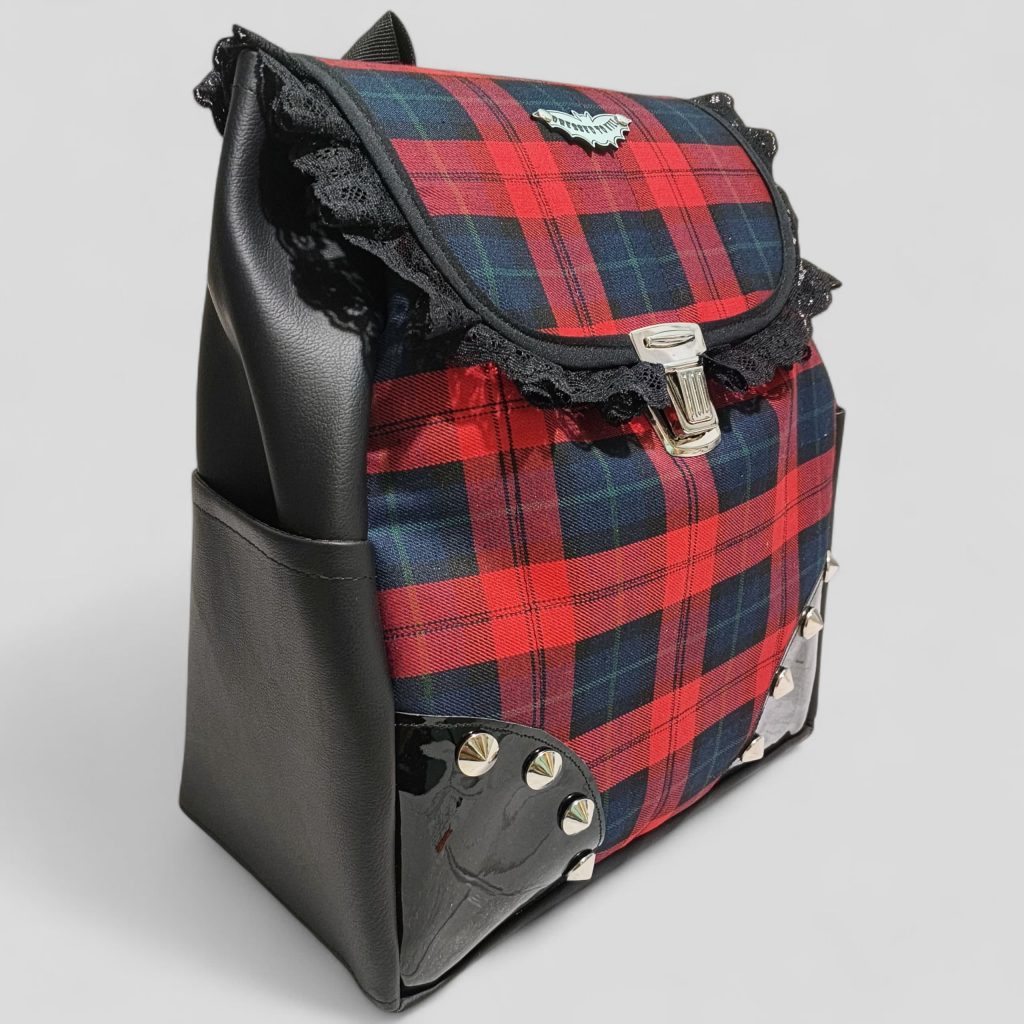 Mochila tipo Morral hecha en ecocuero con tela Tartan rojo, adornada con blonda negra y remaches.