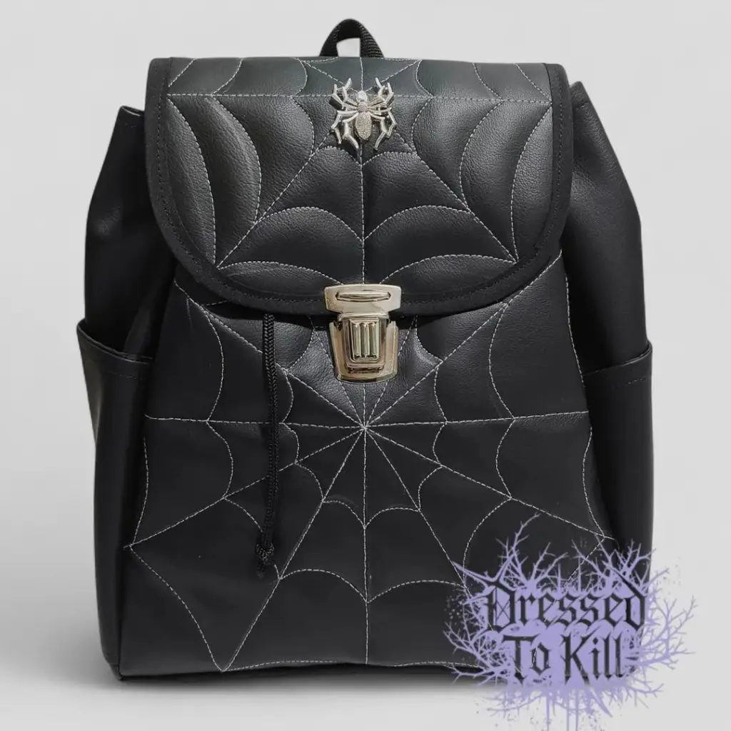 Mochila tipo morral, con bordado de telaraña hecho 100% a mano alzada. Está hecho en ecocuero con herrajes d metal.