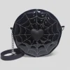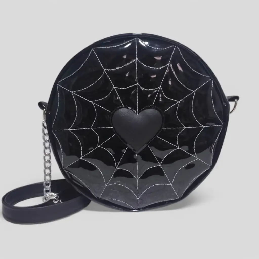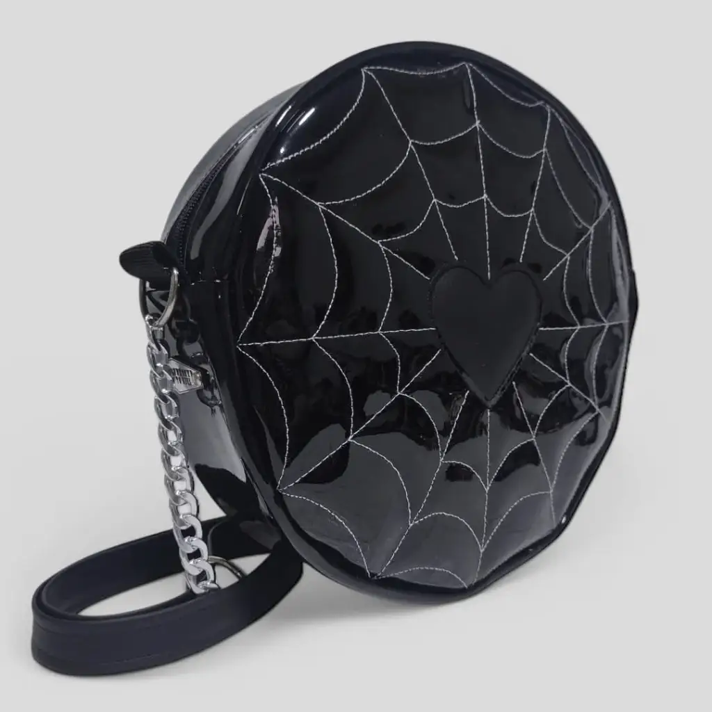 Reinterpretación de nuestra cartera clásica de charol con telaraña bordada. Esta hecha en charol con un detalle de corazón en el centro hecho en ecocuero.